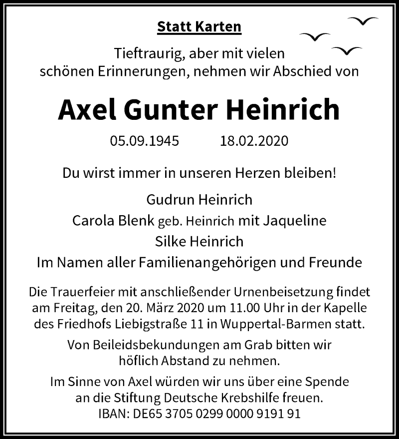 Hier finden Sie alle Traueranzeigen aus der Zeitung, die bisher für Axel Gunter Heinrich erschienen sind. Weitere Traueranzeigen, die in der Zeitung erscheinen, werden hier ebenfalls aufgelistet
