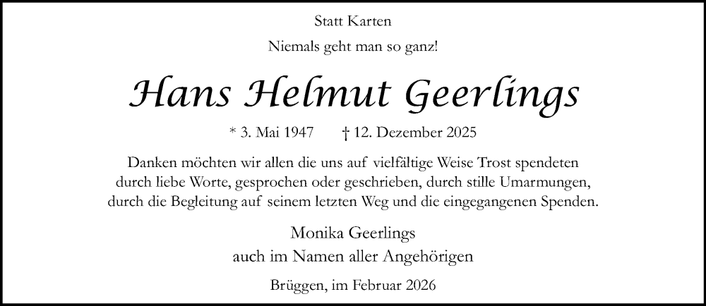Hier finden Sie alle Traueranzeigen aus der Zeitung, die bisher für Hans Helmut Geerlings erschienen sind. Weitere Traueranzeigen, die in der Zeitung erscheinen, werden hier ebenfalls aufgelistet