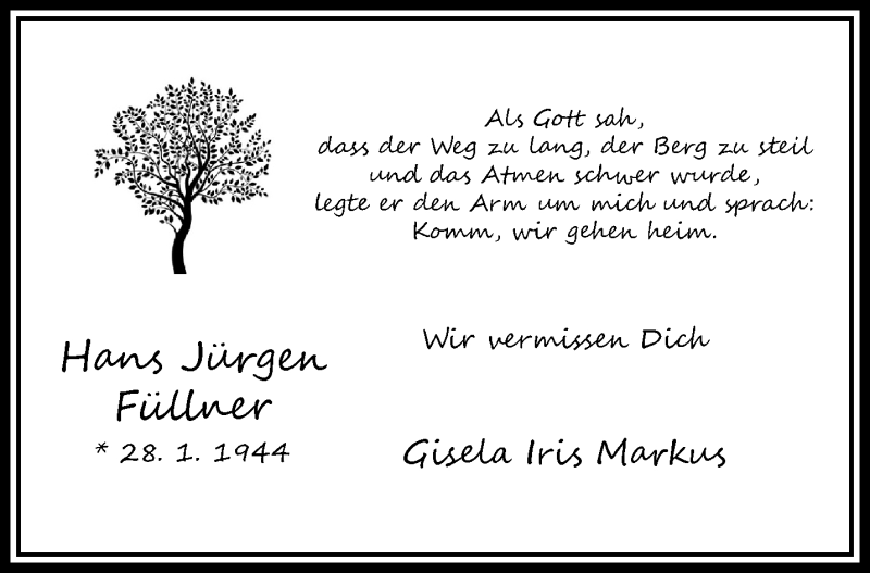 Hier finden Sie alle Traueranzeigen aus der Zeitung, die bisher für Hans Jürgen Füllner erschienen sind. Weitere Traueranzeigen, die in der Zeitung erscheinen, werden hier ebenfalls aufgelistet