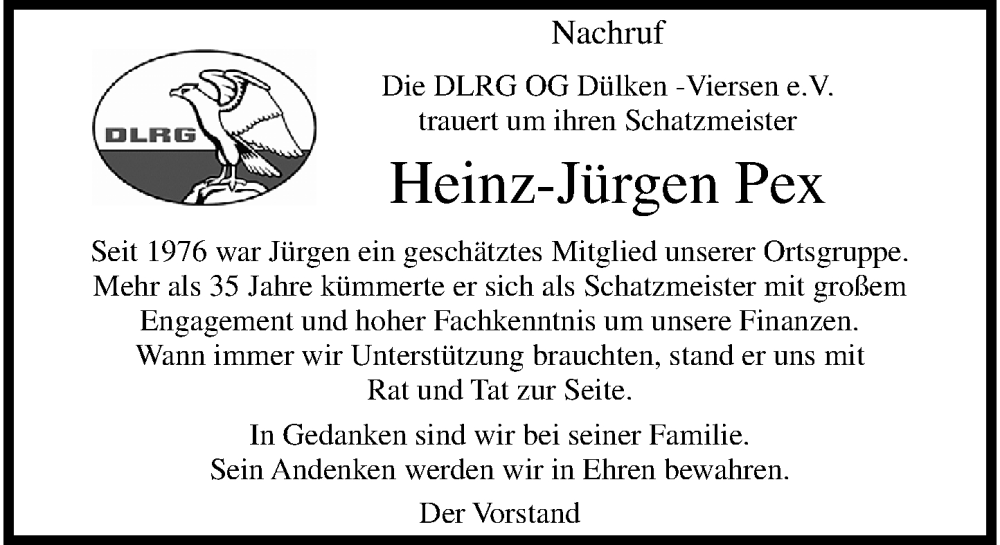 Hier finden Sie alle Traueranzeigen aus der Zeitung, die bisher für Heinz-Jürgen Pex erschienen sind. Weitere Traueranzeigen, die in der Zeitung erscheinen, werden hier ebenfalls aufgelistet