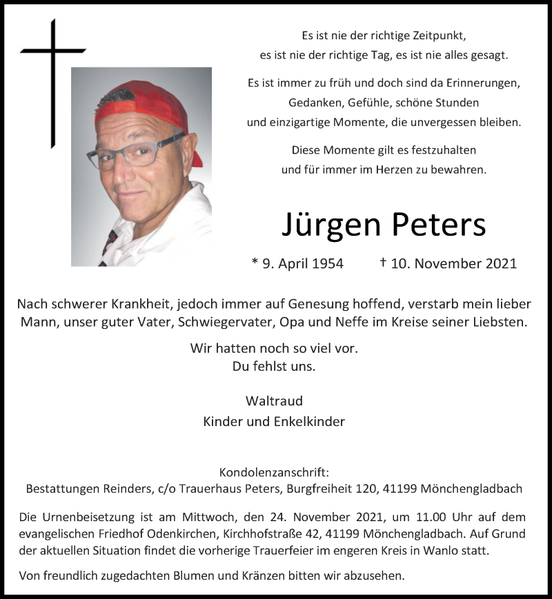 Hier finden Sie alle Traueranzeigen aus der Zeitung, die bisher für Jürgen Peters erschienen sind. Weitere Traueranzeigen, die in der Zeitung erscheinen, werden hier ebenfalls aufgelistet