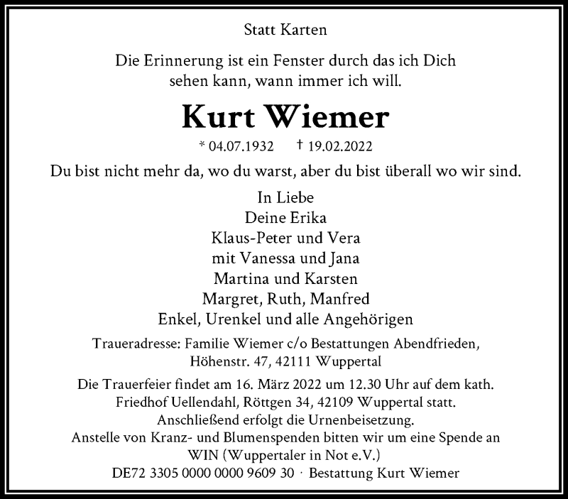 Hier finden Sie alle Traueranzeigen aus der Zeitung, die bisher für Kurt Wiemer erschienen sind. Weitere Traueranzeigen, die in der Zeitung erscheinen, werden hier ebenfalls aufgelistet