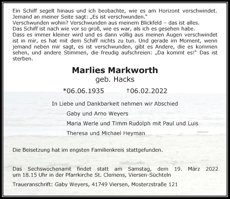 Hier finden Sie alle Traueranzeigen aus der Zeitung, die bisher für Marlies Markworth erschienen sind. Weitere Traueranzeigen, die in der Zeitung erscheinen, werden hier ebenfalls aufgelistet