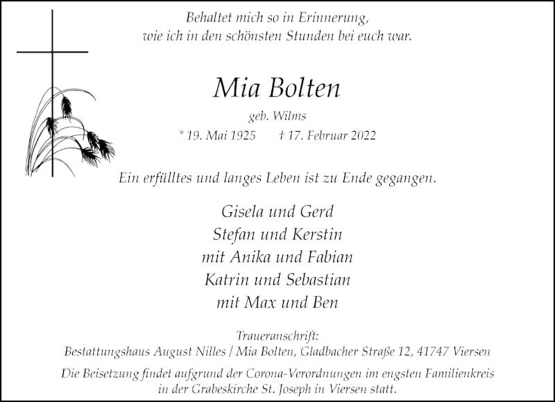 Hier finden Sie alle Traueranzeigen aus der Zeitung, die bisher für Mia Bolten erschienen sind. Weitere Traueranzeigen, die in der Zeitung erscheinen, werden hier ebenfalls aufgelistet